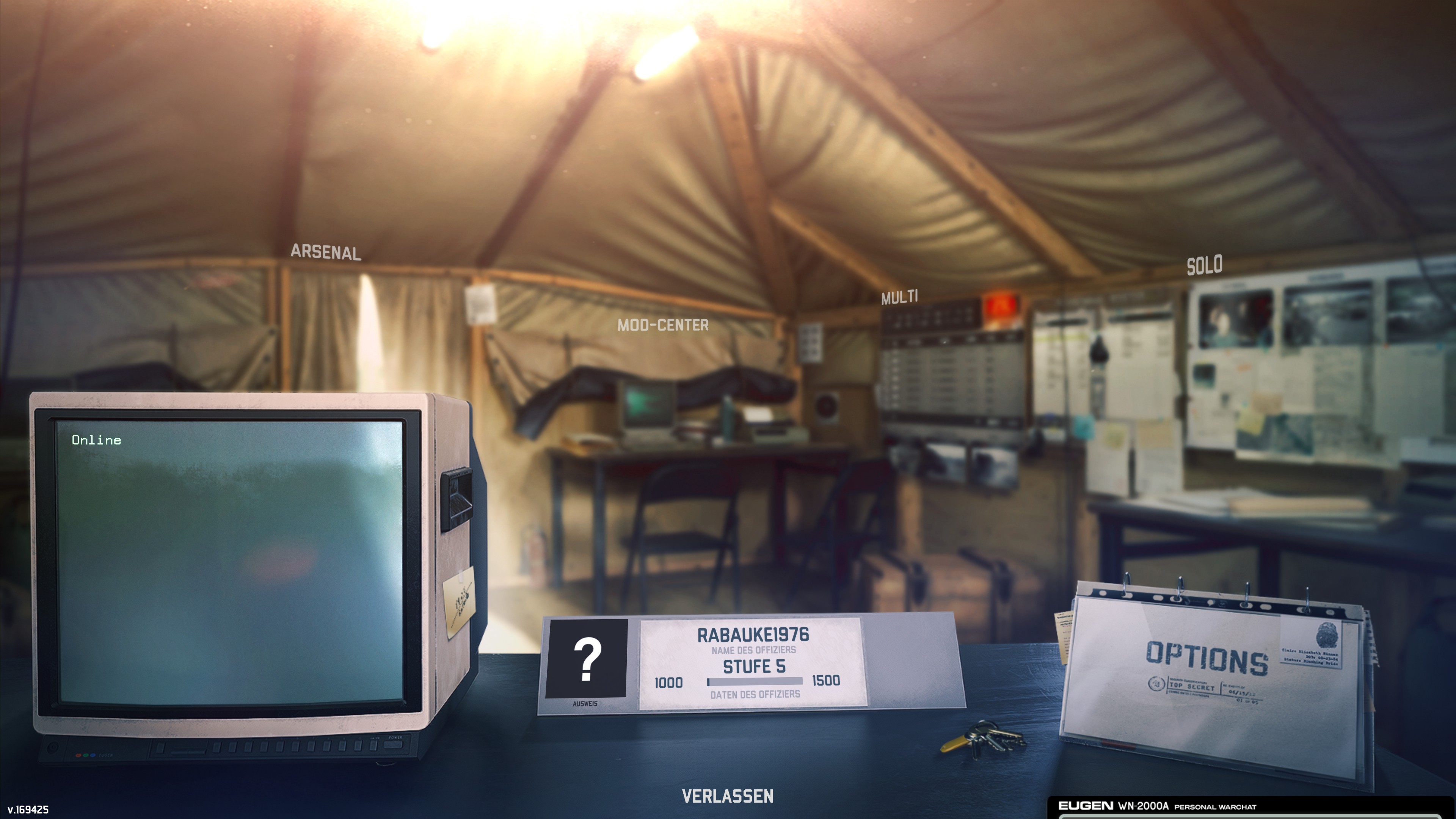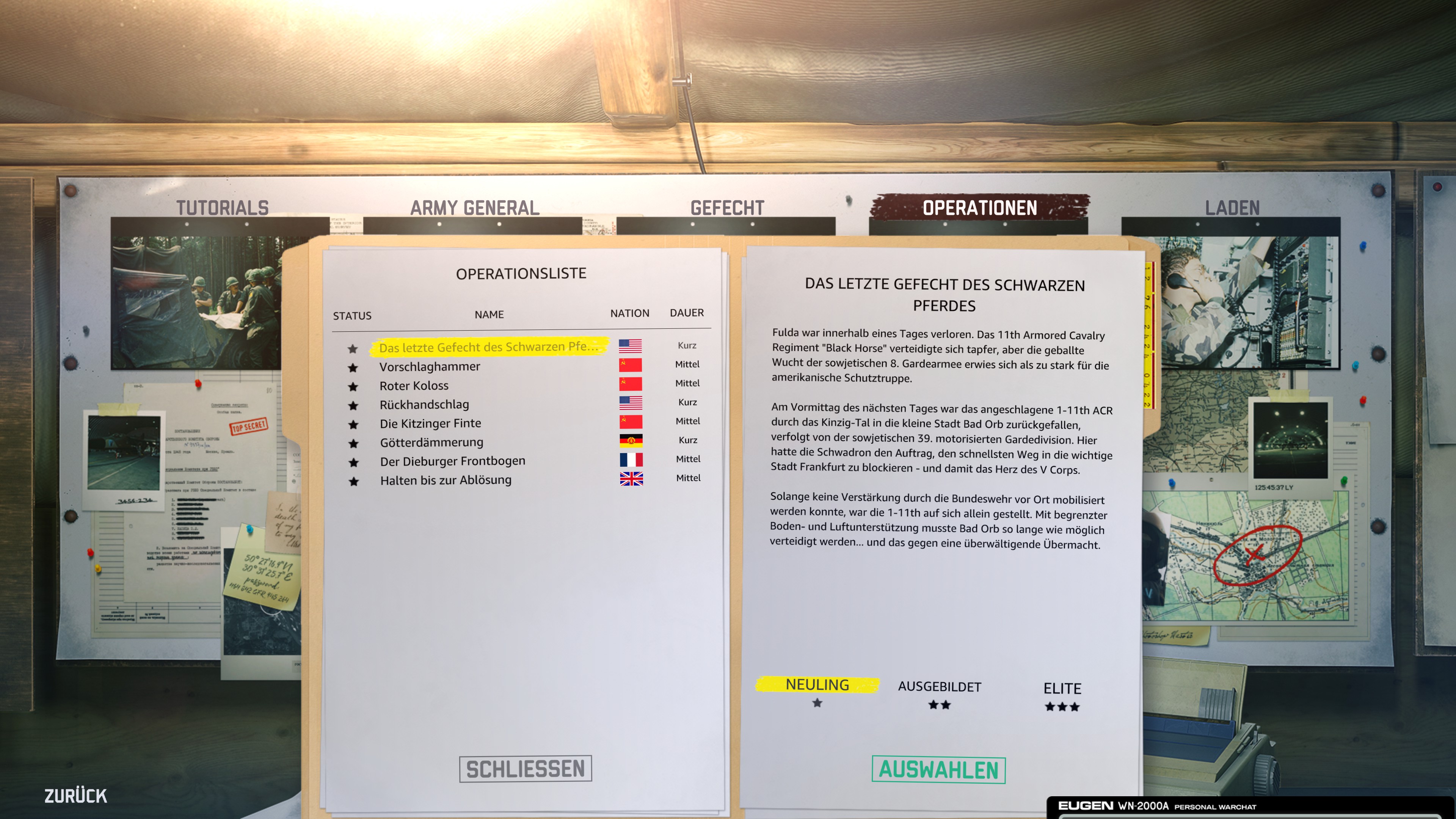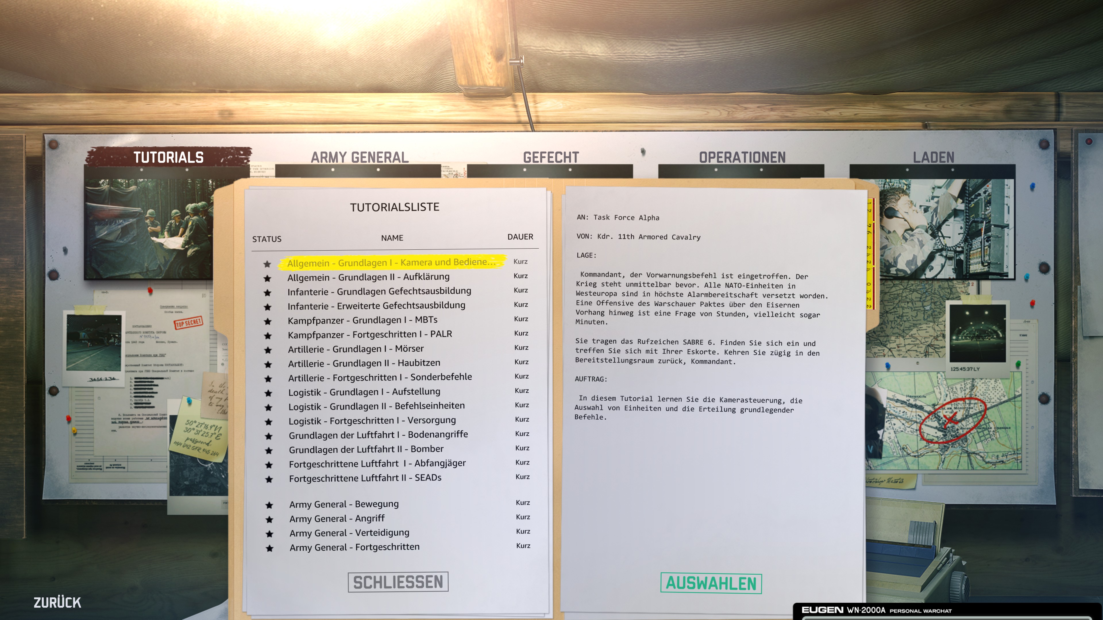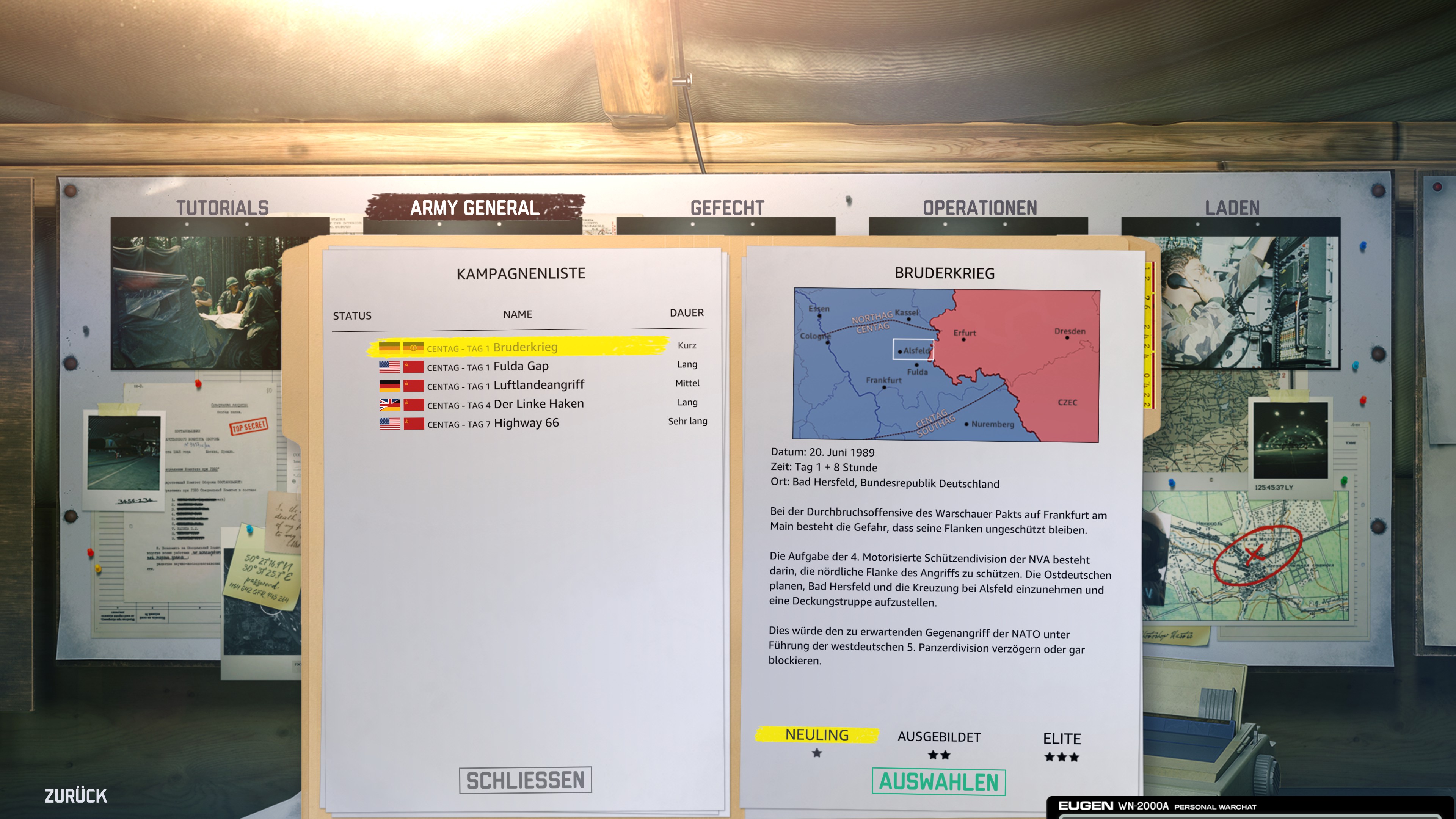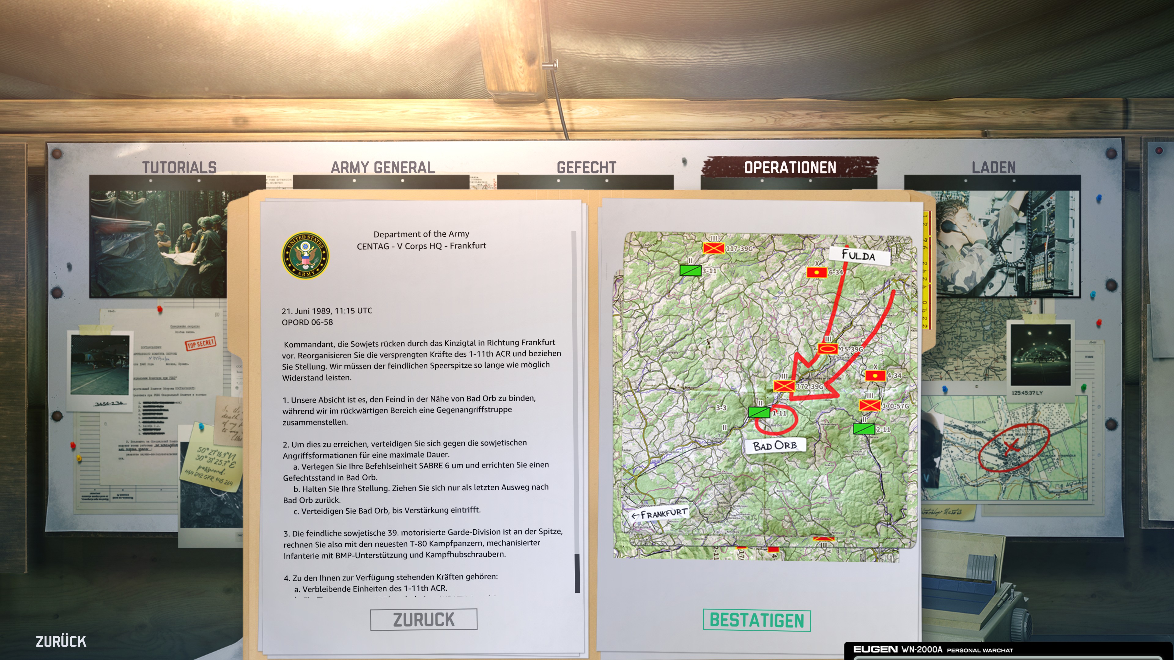Das zentrale Menü von WARNO befindet sich in einem virtuellen Zelt, das euren Gefechtsstand simuliert. Die unterschiedlichen Elemente des Gefechtsstandes ("Flip Charts") ermöglichen die Navigation durch das Menü. Im einzelnen sind dies: