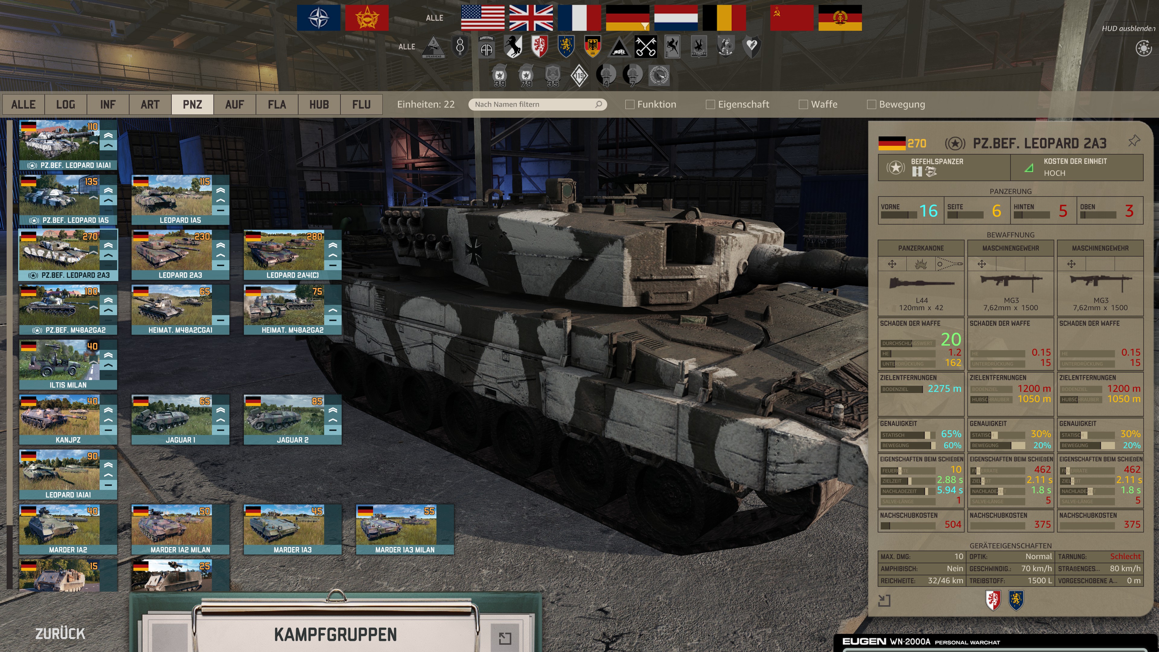 Darüber hinaus bietet WARNO eine historisch weitgehend korrekte Darstellung der Gefechtsgliederung der beteiligten Truppenverbände. Die entsprechende Gliederung ermöglicht euch die Aufschlüsselung der jeweiligen Truppenverbände bis hinunter auf Zugebene.