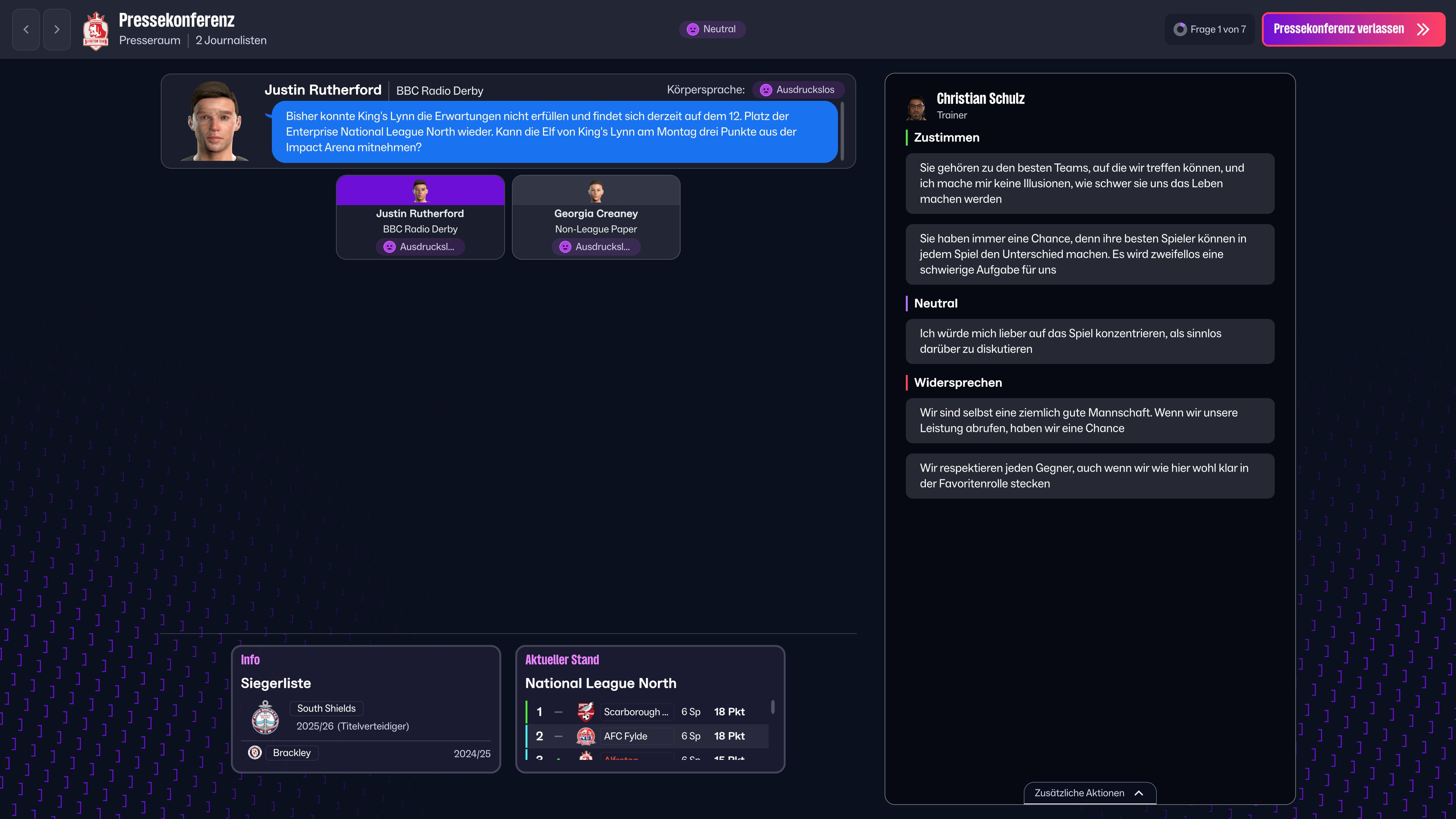 Schon zu Beginn der ersten Testsession fielen uns die größtenteils kompetent übersetzten deutschen Texte im Football Manager 26 auf. Insoweit macht sich kaum bemerkbar, das es sich bei den Entwicklern von Sports Interactive bekanntlich um Briten handelt. Eine akkurate Übersetzung der zahllosen Textbausteine aus dem Englischen ist dabei insbesondere in den wichtigen virtuellen Pressekonferenzen von Nöten. Da es hier in den Antwortmöglichkeiten oftmals auf sprachliche Nuancen ankommt, sollten Spieler mit guten Englischkenntnissen ernsthaft in Erwägung ziehen, den Football Manager 26 in der Originalsprache zu spielen.